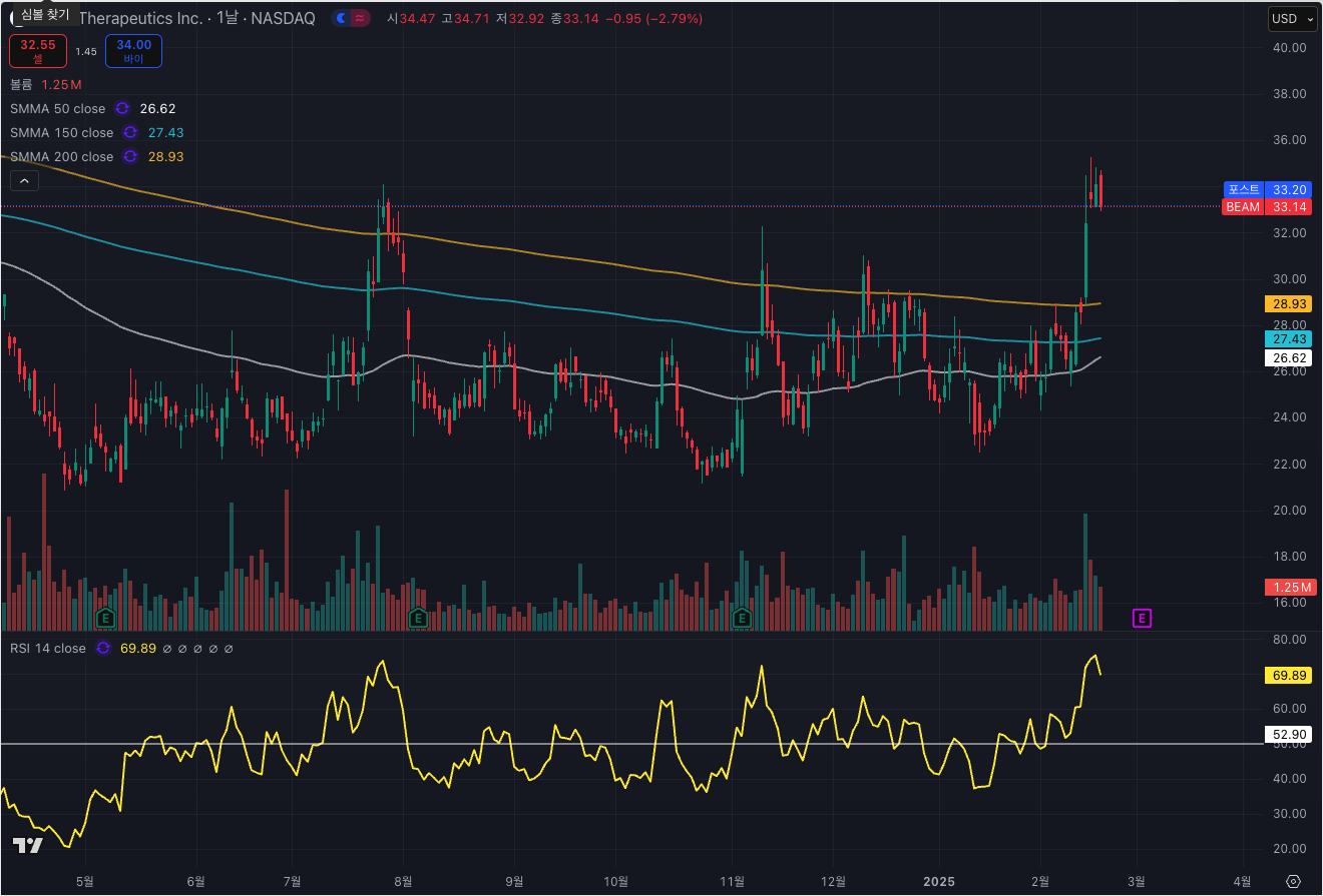 빔 테라퓨틱스는 차세대 유전자 편집 기술인 베이스 에디팅의 선두주자로 장기 성장 가능성이 높으나, 상업화 지연과 임상 시험 리스크가 존재합니다. 2025년 BEAM-101의 임상 2상 결과(ASH 발표)가 주가 변동성의 주요 변수가 될 것이며, 기술적 분석 상 현재 과매수 구간으로 단기 조정 가능성 있습니다. 투자 시 R&D 진행률과 제휴 기업들의 임상 지원 확대를 중점적으로 모니터링해야 합니다.