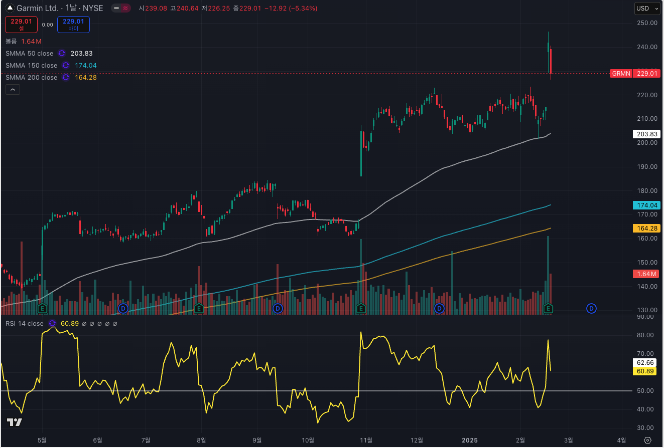 Garmin Ltd. (GRMN)은 수직 통합, 강력한 연구개발 투자 및 다양한 제품 포트폴리오를 바탕으로 GPS 내비게이션 및 웨어러블 기술 시장에서 강력한 위치를 유지하고 있습니다. 글로벌 GPS 시장은 2023년부터 2032년까지 연평균 16% 성장할 것으로 예상되며, 웨어러블 기술 부문은 2024년부터 2033년까지 13.58%의 CAGR로 확장되고 있습니다. Garmin은 GPS 기기에서 35.2%, 피트니스 웨어러블에서는 28.7%의 시장 점유율을 보유하며 Apple과 Samsung과 경쟁하고 있습니다. 기술적 지표들은 강세 모멘텀을 시사하며, 2028년까지 주가가 243달러에서 265달러 사이로 예상됩니다.